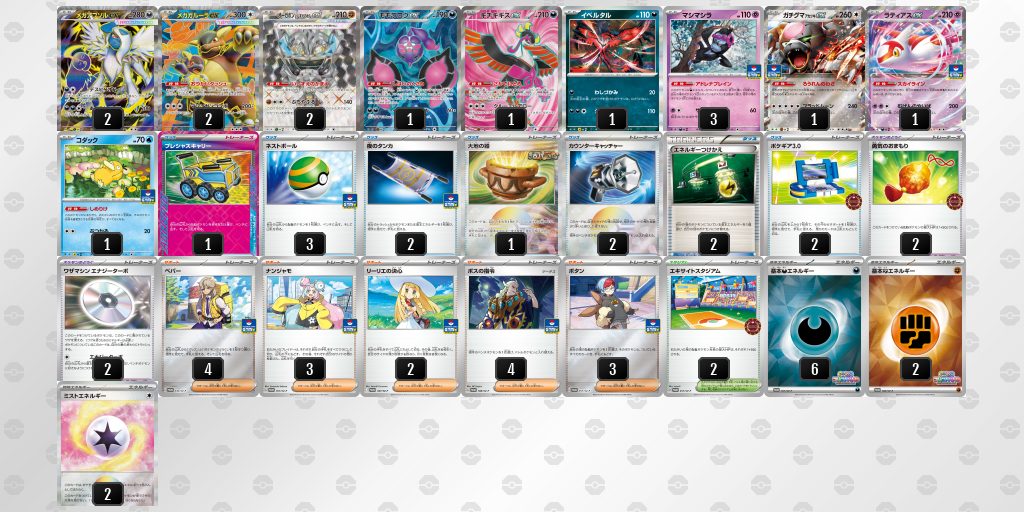 スポンサーリンク シティリーグシーズン2 11月20日(木) 大会結果 大会結果 2025.11.21大会結果会場 東京優勝 メガガルーラex(メガアブソルex)準優勝 サーナイトexベスト4ドラパルトex(リザードンex)ブースターex(ヨルノズク)東京優勝メガガルーラex(メガアブソルex)デッキコード cDY8xD-7dZWlf-Y88cxa準優勝サーナイトexデッキコード QgngnH-khzaxe-LLNQL9ベスト4ドラパルトex(リザードンex)デッキコード wkVdvV-fB77YK-Vk5Vkkブースターex(ヨルノズク)デッキコード 8x8cDJ-o19LbK-YxxJcx
