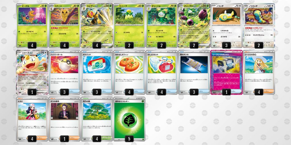 自分の場に「スピアーex」を大量に並べて、「ビーランブル」で相手に大ダメージを与えていくデッキ。