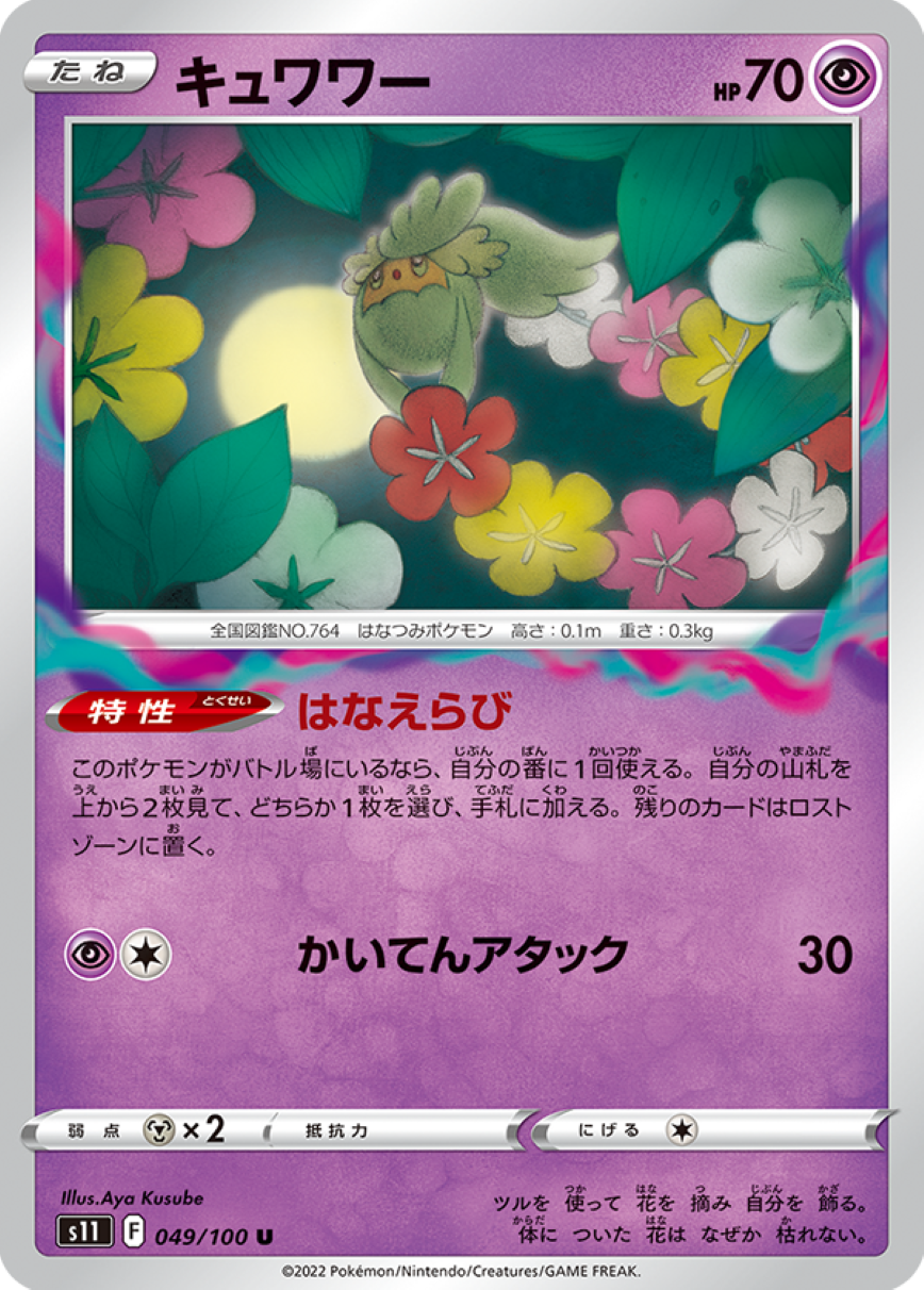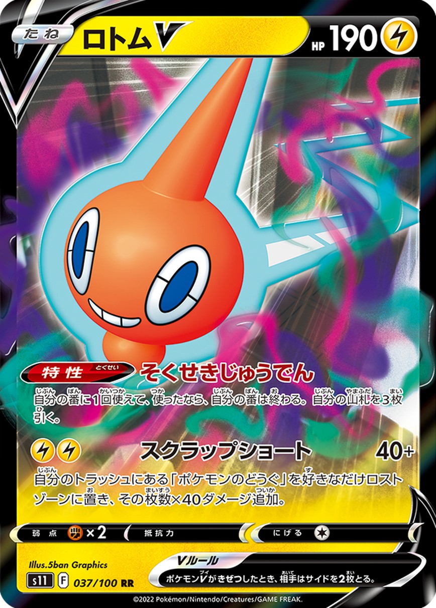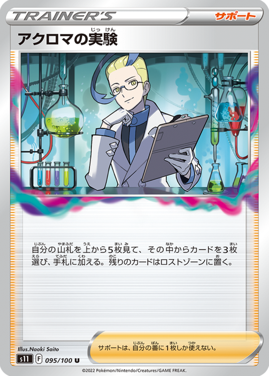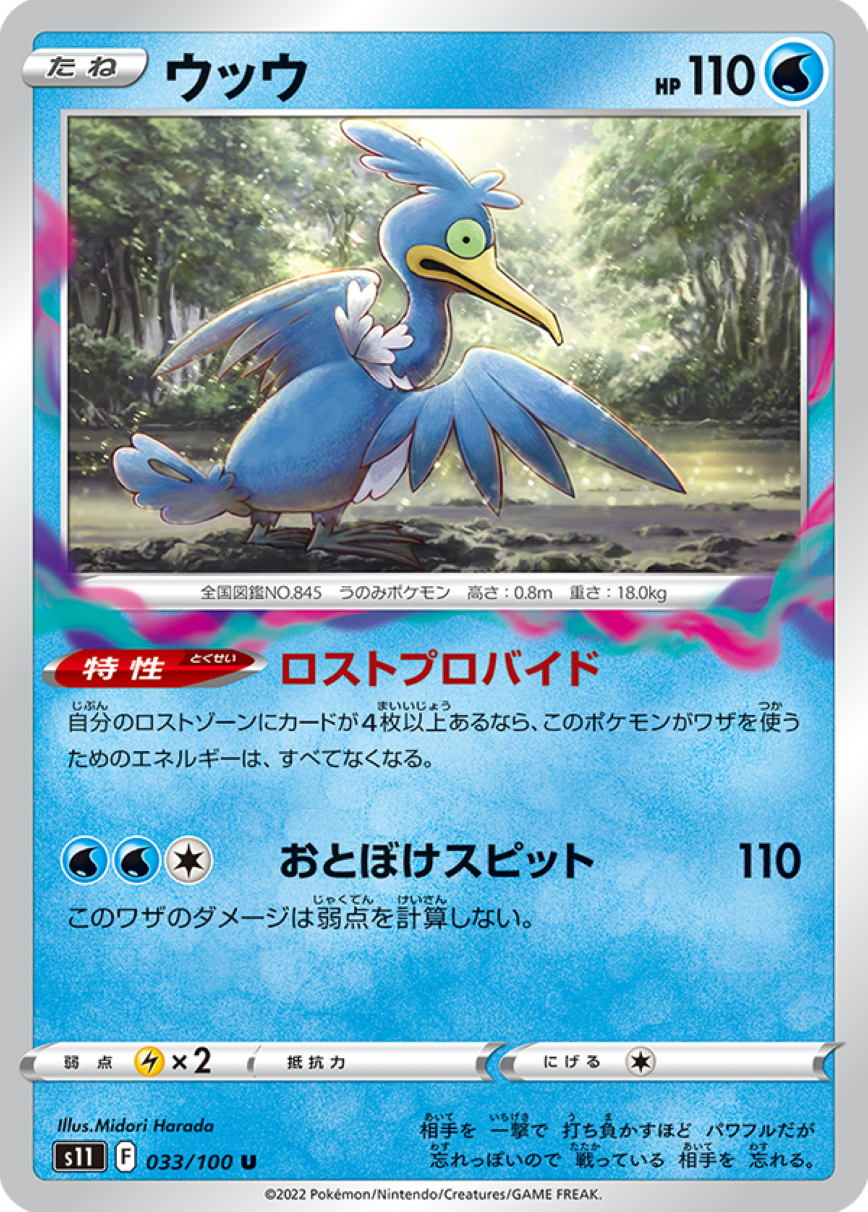 特性が強力で、このポケモンがバトル場にいると、デッキの上から2枚見て、1枚を手札に、もう1枚をロストゾーンに送ることができる。