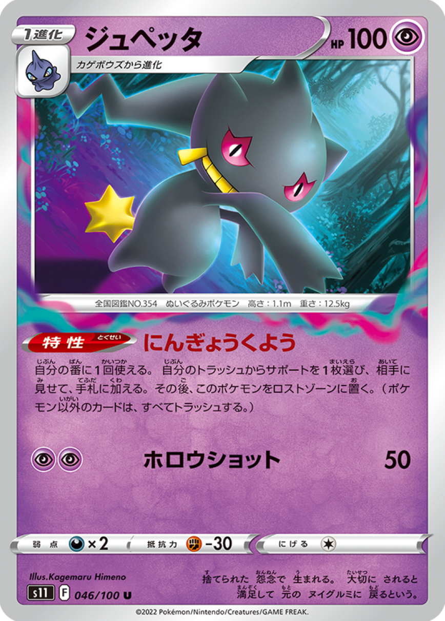 特性が強力で、このポケモンをロストゾーンに送ると、トラッシュからサポートを1枚手札に持ってくることができる。